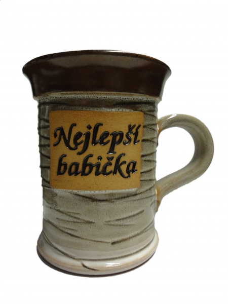 Keramický hrnček s nápisom.