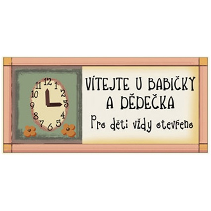 Drevená ceduľa s nápisom: "Vítejte u babičky a dědečka. Pro děti vždy otevřeno."