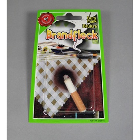 Tento nedopalok cigarety s prilepenou čiernou škvrnou môže vydesiť Vašu mamičku, alebo manželku. Po položení na látkový podklad to vyzerá, že ste si odložili zapálenú cigaretu a vypálili tak dieru napr. do ubrusu.