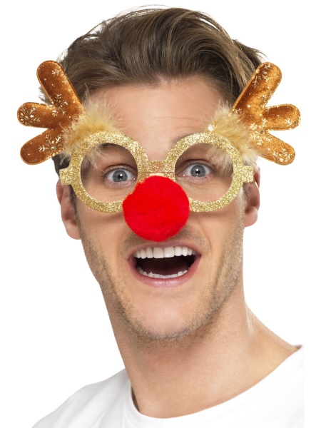 Veľké zlatisté okuliare s malými sobími parôžkami po stranách a s veľkým červeným nosom.