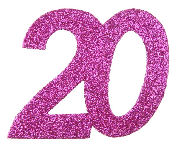 Trblietavé konfety v tvare čísla 20 v ružovej farbe.