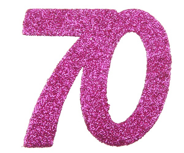 Trblietavé konfety v tvare čísla 70 v ružovej farbe.