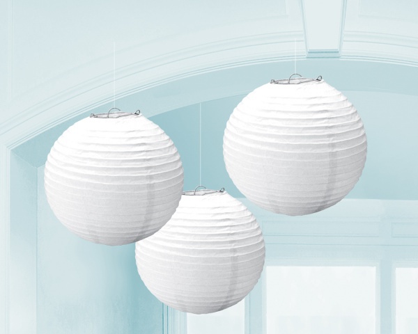 3 závesné gule v bielej farbe krásne doladia párty výzdobu. Táto dekorácia je vhodná na narodeninové oslavy alebo iné večierky.