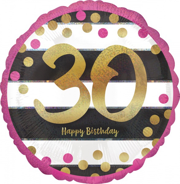 Okrúhly fóliový balónik vhodný na oslavu 30. narodenín. Tento doplnok je skvelou narodeninovou dekoráciou alebo darčekom.