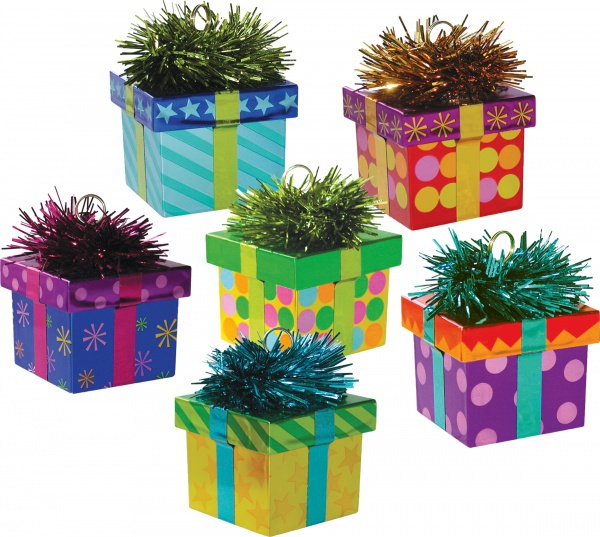 Závažie v tvare darčeku s mašľou na uchytenie balónikov nafúknutých héliom na jednom mieste.